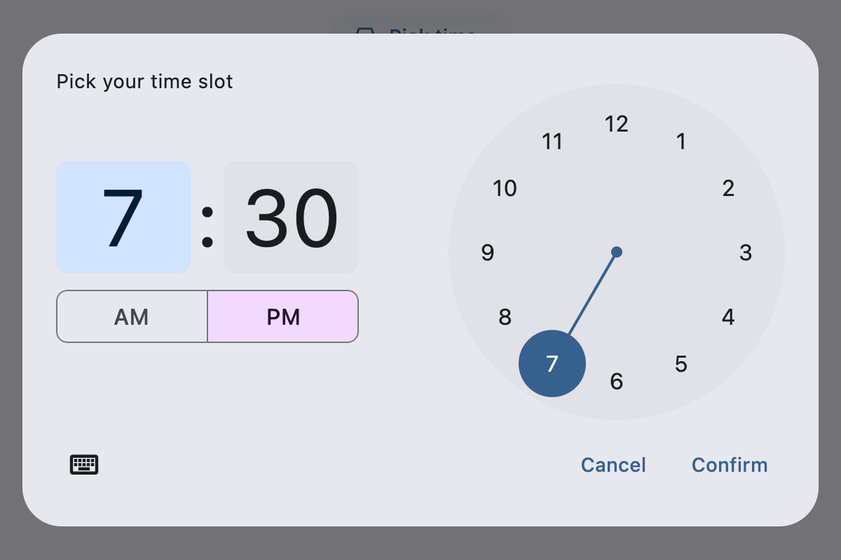 time_picker = ft.TimePicker(